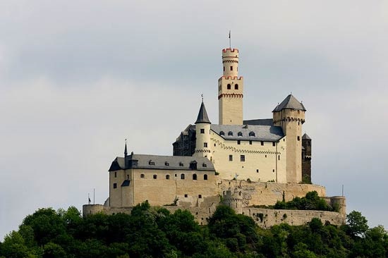 The Marksburg is a castle above the town of Braubach in Rhineland-Palatinate, Germany. It is one of the principal sites of the Rhine Gorge UNESCO World Heritage Site. The fortress was used for protection rather than as a residence for royal families. It has a striking example of a bergfried designed as a butter-churn tower. Of the 40 hill castles between Bingen am Rhein and Koblenz the Marksburg was the only one which was never destroyed.