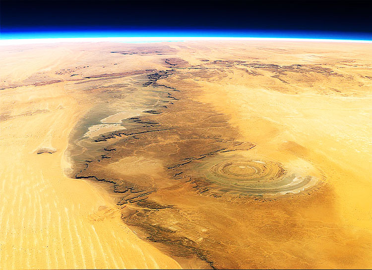The Richat Structure, also known as the Eye of the Sahara and Guelb er Richat, is a prominent circular feature in the Sahara near Ouadane, west–central Mauritania.