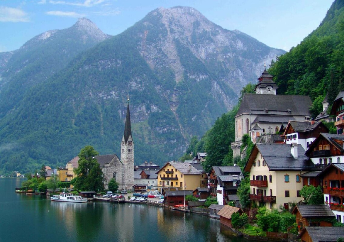 The unique, UNESCO-protected Lake Hallstatt and lush mountains, towering directly from the shore.